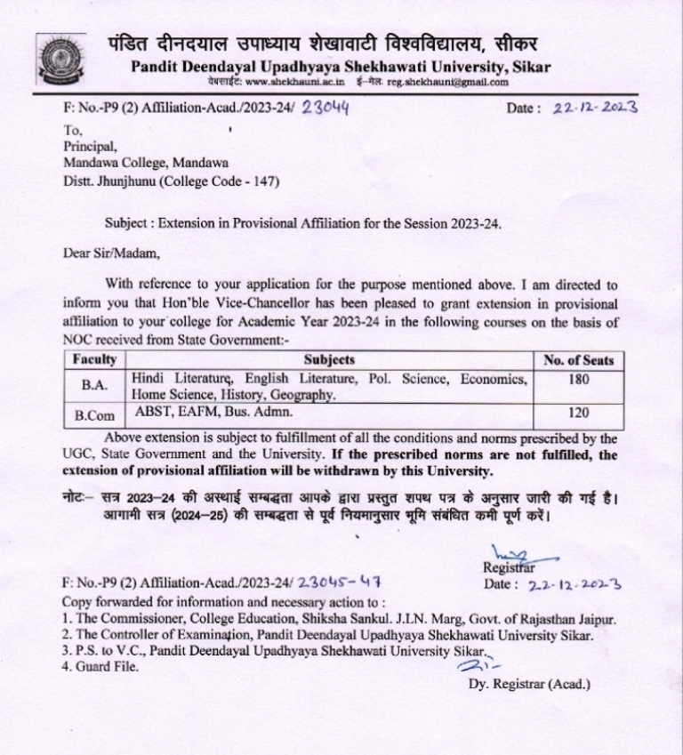 Mandawa College, Mandawa a college exclusively for girls & boys, affiliated to the Pandit Deendayal Upadhyaya Shekhawati University, Sikar set up in a sprawling lush green campus, is being run with commitment to make an indelible mark in the field of education by creating a global study center of excellence.